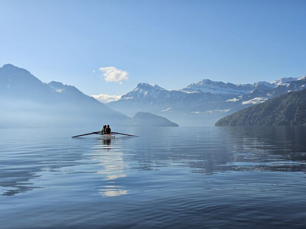 Alles an Bord von Wernli und Sanssouci verstaut, geht es auch schon los. Während wir in unserem gemeinsamen Rhythmus über das Wasser gleiten, verwandeln die ersten Sonnenstrahlen den See in einen Glitzerteppich. Atemberaubend schön, fast schon kitschig, die unwirkliche Traumkulisse aus silbern funkelndem Wasser, gestochen scharfen Bergkonturen und strahlend blauem Himmel. An Bord wird geschwärmt, geschnattert und gelacht – und immer wieder für die Erinnerungsfotos an diesen perfekten Vormittag posiert… Bestaunt werden sie gemeinsam beim abschliessenden Brunch im Seeclub, bevor wir alle mit einem unbeschreiblichen Hochgefühl die Heimreise antreten und die nächste Wanderfahrt kaum erwarten können.